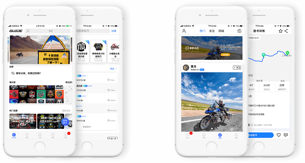 专业摩托车工具app,提供详细的骑行数据线路,精品俱乐部发现平台,实时打点标记沿途风景,全国摩友长途骑行线路分享,关注摩旅达人实时交流骑行经验,打造简单易用的使用体验